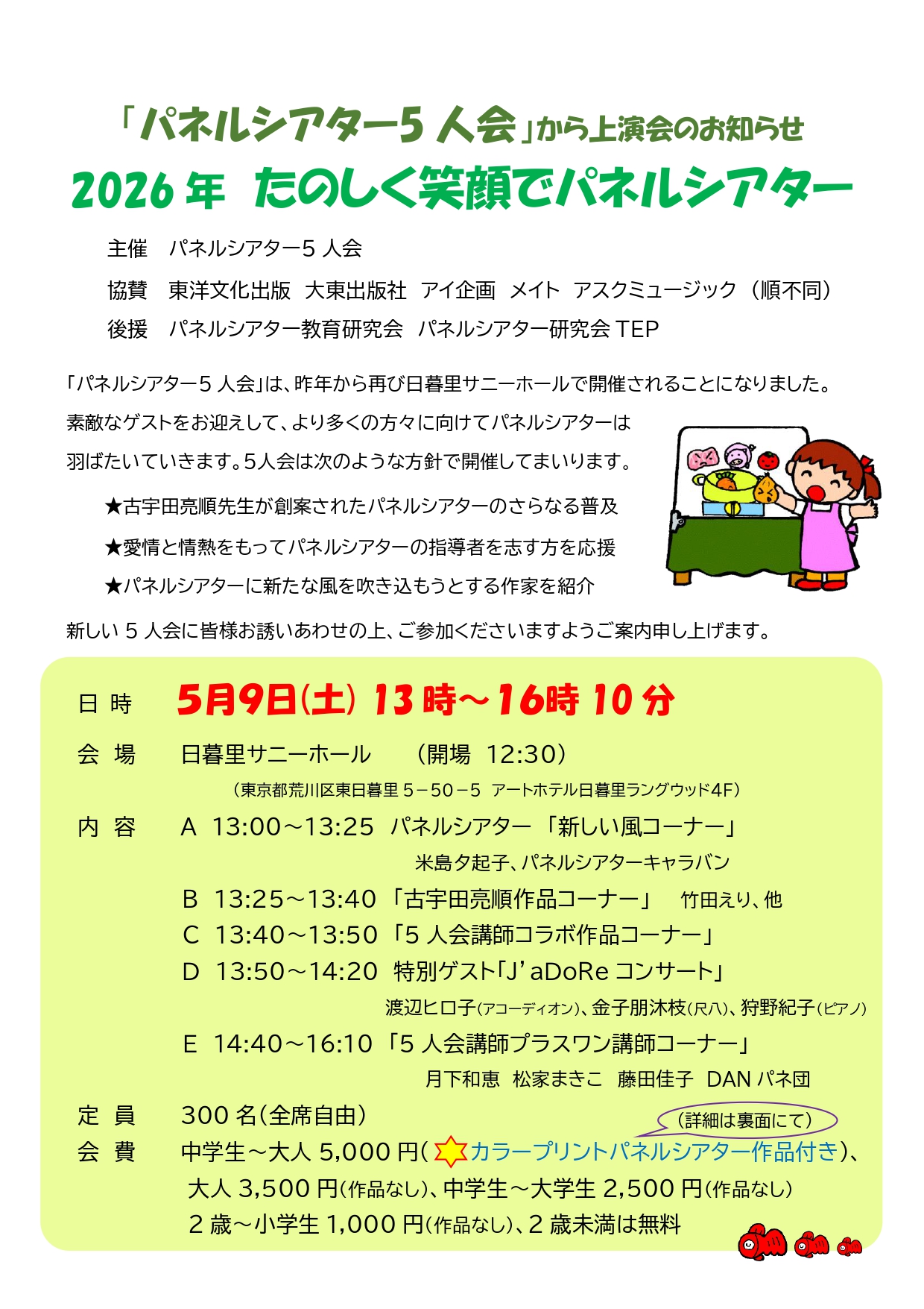 | パネルシアター5人会主催 2026年 たのしく笑顔でパネルシアター 2026年5月9日(土)13:00〜16:10 主催:パネルシアター5人会 場所:日暮里サニーホール 東京都荒川区東日暮里5-50-5 アートホテル日暮里ラングウッド4F 内容:A 13:00〜13:25 パネルシアター「新しい風コーナー」 米島夕起子、パネルシアターキャラバン B 13:25〜13:40 「古宇田亮順作品コーナー」竹田えり、他 C 13:40〜13:50 「5人会講師コラボ作品コーナー」 D 13:50〜14:20 特別ゲスト「J'aDoRe コンサート」 渡辺ヒロ子(アコーディオン)、金子朋沐枝(尺八)、狩野紀子(ピアノ) E 14:40〜16:10 「5人会講師プラスワン講師コーナー」 月下和恵、松家まきこ、藤田佳子、DANパネ団 定員:300名(全席自由) 会費:中学生〜大人 5,000円(カラープリントパネルシアター作品付) 大人 3,500円(作品なし)、中学生〜大学生 2,500円(作品なし) 2歳〜小学生 1,000円(作品なし)、2歳未満無料 お申し込み:3月1日(日)お申し込み受付開始 PEATIXでのお申し込み:https://panel-5ninkai2026.peatix.com/ Googleフォームでのお申し込み:https://forms.gle/h72Bm5g7zVQ17ZsNA ※上記でのお申し込みが困難な方は下記メールアドレスにお問い合わせください。 お問い合わせ:panel.5ninkai@gmail.com 最新情報をお知りになりたい方は、 「5人会お知らせグループLINE」に登録してください。 ![]() このページをスマホで見ている方はこちらからどうぞ→5人会お知らせグループLINE チラシ:ダウンロード ![]() ![]() |