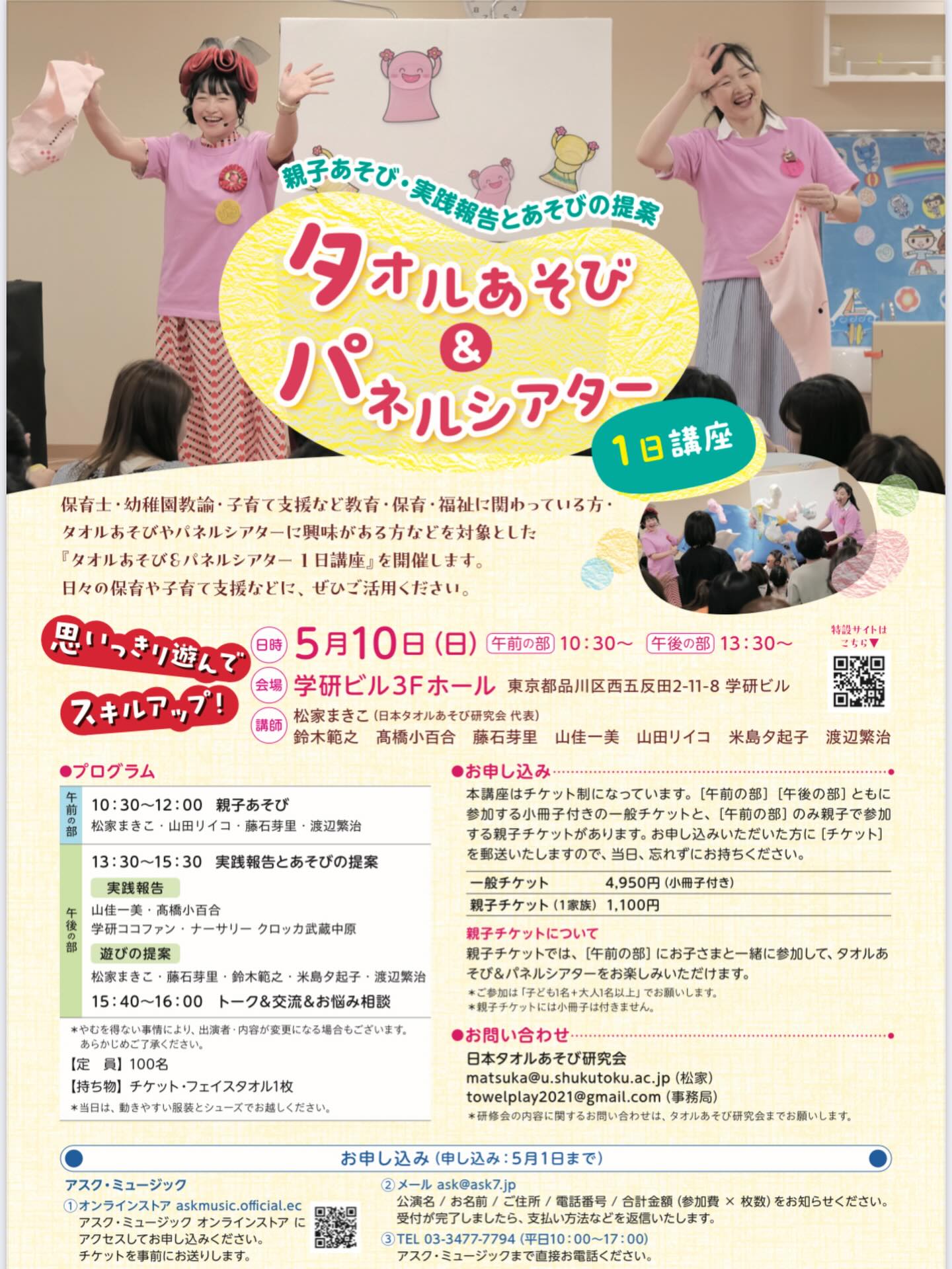 タオルあそび&パネルシアター 1日講座 2026年5月10日(日)10時30分〜(10時開場) 主催:日本タオルあそび研究会 共催:学研ココファン・ナーサリー/アスク・ミュージック 場所:学研ビル3Fホール(東京都品川区西五反田2-11-8 学研ビル) 講師:松家まきこ・渡辺繁治・藤石芽里・山田リイコ・鈴木範之・山佳一美・米島夕起子・橋小百合 受講料:一般チケット 4,950円 (午前の部・午後の部・小冊子付) 親子チケット(1家族) 1,100円 (午前の部のみ) 定員:100名 内容:[午前の部]10:30〜12:00 親子あそび 松家まきこ・山田リイコ・藤石芽里・渡辺繁治 [午後の部]13:30〜15:30 実践報告とあそびの提案 〈実践報告〉 山佳一美・橋小百合・学研ココファン・ナーサリー クロッカ武蔵中原 〈遊びの提案〉 松家まきこ・藤石芽里・鈴木範之・米島夕起子・渡辺繁治 15:40〜16:00 トーク&交流&お悩み相談 お申し込み:アスク・ミュージック(お申し込みは5月1日まで) 1)オンラインストア askmusic.official.ec 2)メール ask@ask7.jp 3)電話 03-3477-7794 お問い合わせ:タオルあそび研究会 matsuka@u.syukutoku.ac.jp(松家) towelplay2021@gmail.com(事務局) *当日はチケット・フェイスタオル1枚をお持ちください ![]() |