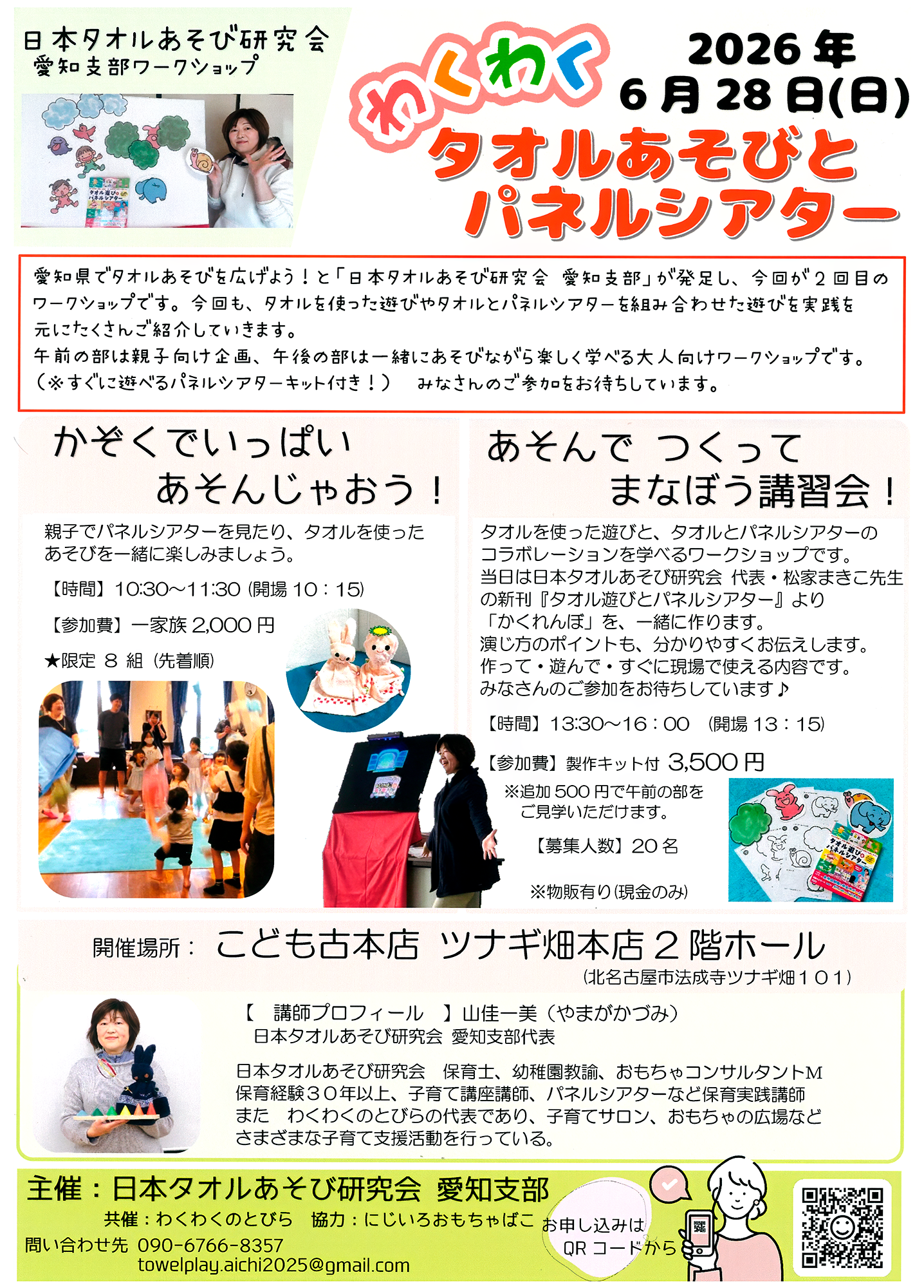 わくわく タオルあそびとパネルシアター 2026年6月28日(日) 《かぞくでいっぱいあそんじゃおう!》10時30分〜11時30分(開場10時15分) 《みんなでつくってまなぼう講習会!》13時30分〜16時(開場13時15分) 主催:日本タオルあそび研究会 愛知支部 共催:わくわくのとびら 場所:こども古本店 ツナギ畑本店2階ホール(愛知県北名古屋市法成寺ツナギ畑101) 講師:山佳一美(やまがかづみ) 参加費:《かぞくでいっぱいあそんじゃおう!》 一家族 2,000円 限定8組(先着順) 《みんなでつくってまなぼう講習会!》3,500円(製作キット付) 募集人数20人 お申し込み:メールフォーム お問い合わせ:towelplay.aichi@gmail.com ![]() |