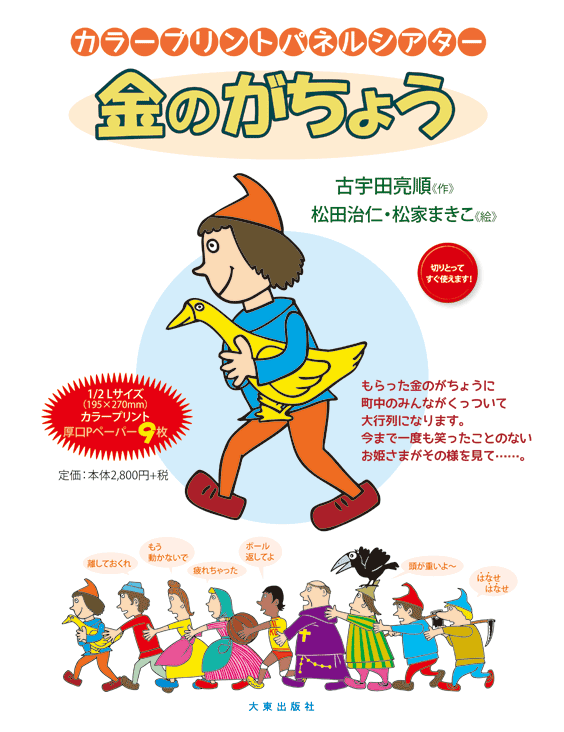 もらった金のがちょうに町中のみんながくっついて大行列になります。生れてから一度も笑ったことのないお姫さまがその様を見て……。有名なグリム童話がパネルシアターになりました。 |