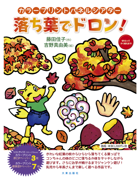 厚口カラープリント1/2Lサイズ(195×270mm)…7枚 脚本、手遊びの仕方、楽譜、絵人形の作り方、保存用袋 |
