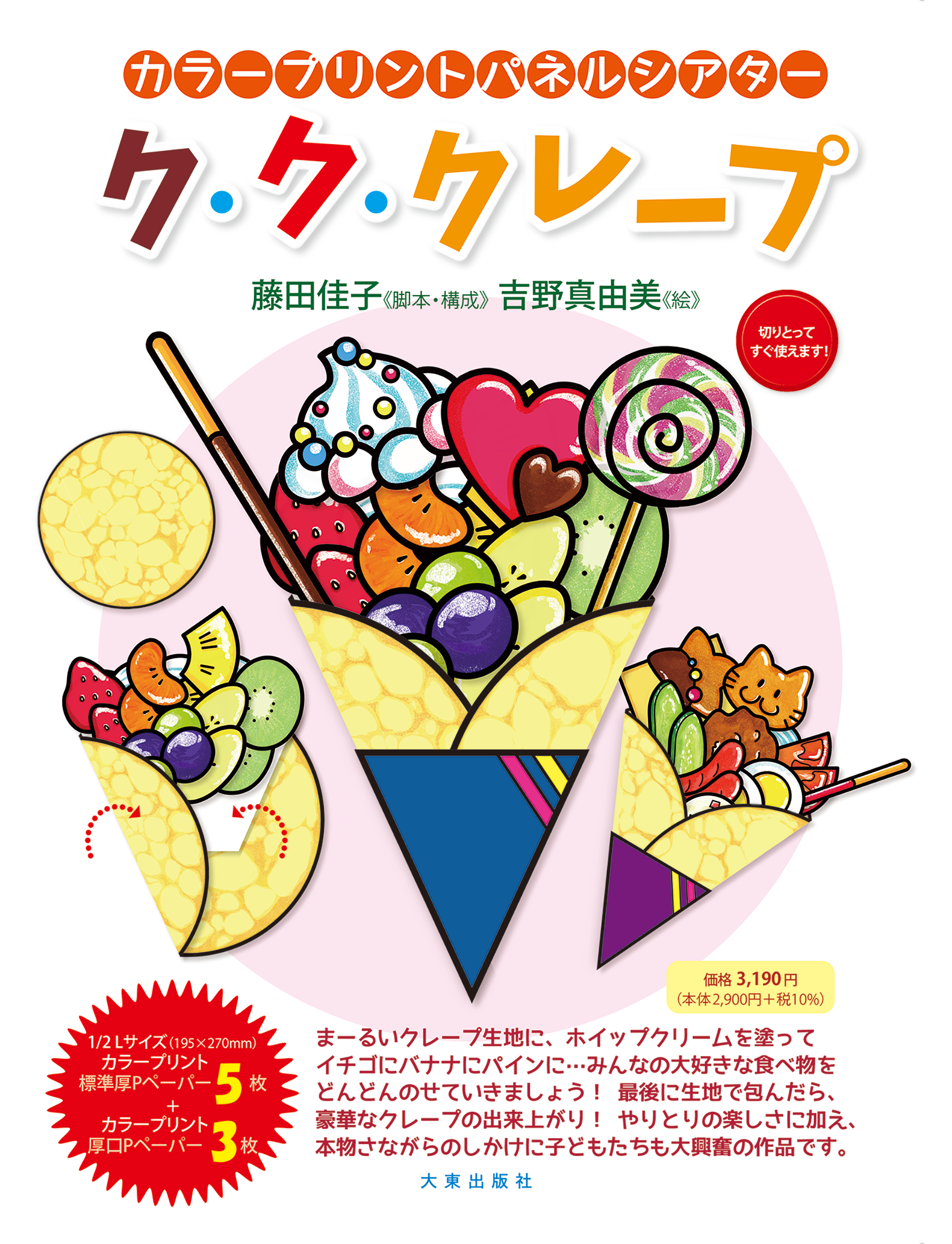 まーるいクレープ生地に、あまーいホイップクリームを塗って、イチゴにバナナに・・・みんなの大好きな食べ物をどんどんのせていきましょう! 最後に生地で包んだら、豪華なクレープの出来上がり! やりとりの楽しさに加え、本物さながらのしかけに子どもたちも大興奮の作品です。