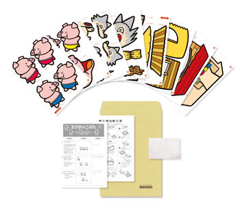 厚口カラープリント1/2Lサイズ(195×270mm)…8枚 脚本、手遊びの仕方、楽譜、絵人形の作り方、保存用袋 |