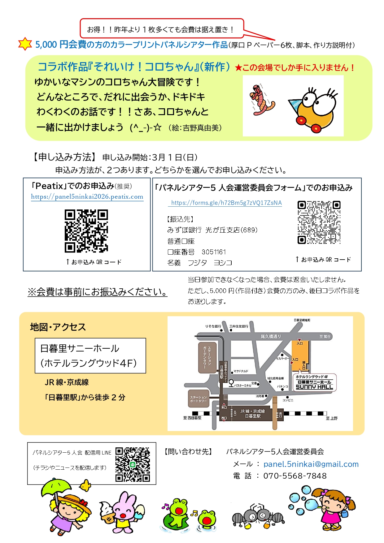 | パネルシアター5人会主催 2026年 たのしく笑顔でパネルシアター 2026年5月9日(土)13:00〜16:10 主催:パネルシアター5人会 場所:日暮里サニーホール 東京都荒川区東日暮里5-50-5 アートホテル日暮里ラングウッド4F 内容:A 13:00〜13:25 パネルシアター「新しい風コーナー」 米島夕起子、パネルシアターキャラバン B 13:25〜13:40 「古宇田亮順作品コーナー」竹田えり、他 C 13:40〜13:50 「5人会講師コラボ作品コーナー」 D 13:50〜14:20 特別ゲスト「J'aDoRe コンサート」 渡辺ヒロ子(アコーディオン)、金子朋沐枝(尺八)、狩野紀子(ピアノ) E 14:40〜16:10 「5人会講師プラスワン講師コーナー」 月下和恵、松家まきこ、藤田佳子、DANパネ団 定員:300名(全席自由) 会費:中学生〜大人 5,000円(カラープリントパネルシアター作品付) 大人 3,500円(作品なし)、中学生〜大学生 2,500円(作品なし) 2歳〜小学生 1,000円(作品なし)、2歳未満無料 お申し込み:3月1日(日)お申し込み受付開始 PEATIXでのお申し込み:https://panel-5ninkai2026.peatix.com/ Googleフォームでのお申し込み:https://forms.gle/h72Bm5g7zVQ17ZsNA ※上記でのお申し込みが困難な方は下記メールアドレスにお問い合わせください。 お問い合わせ:panel.5ninkai@gmail.com 最新情報をお知りになりたい方は、 「5人会お知らせグループLINE」に登録してください。 ![]() このページをスマホで見ている方はこちらからどうぞ→5人会お知らせグループLINE チラシ:ダウンロード ![]() ![]() |